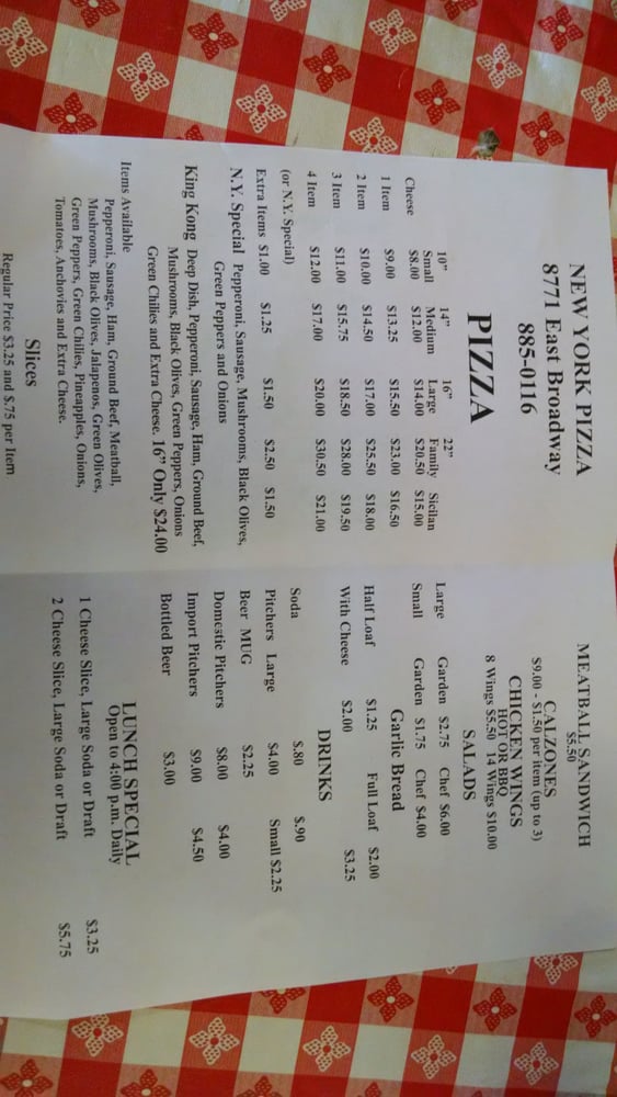 New York Pizza, located at 8771 E Broadway Blvd in Tucson, AZ, offers a variety of pizza options, including Cheese Pizza with the choice of additional toppings such as Pepperoni, Sausage, Ham, Ground Beef, and Meatball. They also offer a Cheese Pizza with 1 Topping option with the choice of a free topping and extra toppings available. For those looking for a quick bite, they have Pizza by the Slice with the option to add toppings for an additional charge. In addition to their pizza offerings, they have a Meatball Sandwich available for those who prefer a different option. Customers rave about the authentic New York-style pizza, with some even comparing it to what you would find in New York City. With a casual ambiance, great service, and delicious pizza, New York Pizza is a must-visit for pizza lovers in Tucson.